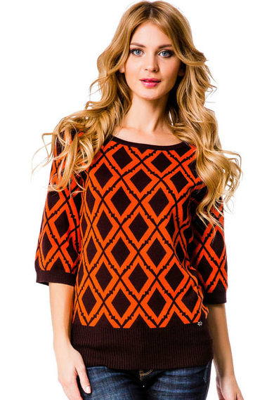 ОписаниеСтильный джемпер приталенного силуэта с широкими рукавами 3/4. Джемпер украшен контрастным оранжевым принтом, на манжетах и по низу изделия отделан широкой трикотажной резинкой в рубчик.