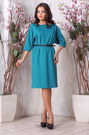 ОписаниеКрасивое платье прямого кроя, с рукавами 3/4. Модель бирюзового цвета, длиной до колен, на поясе платье можно прихватить ремнем, который входит в стоимость изделия.